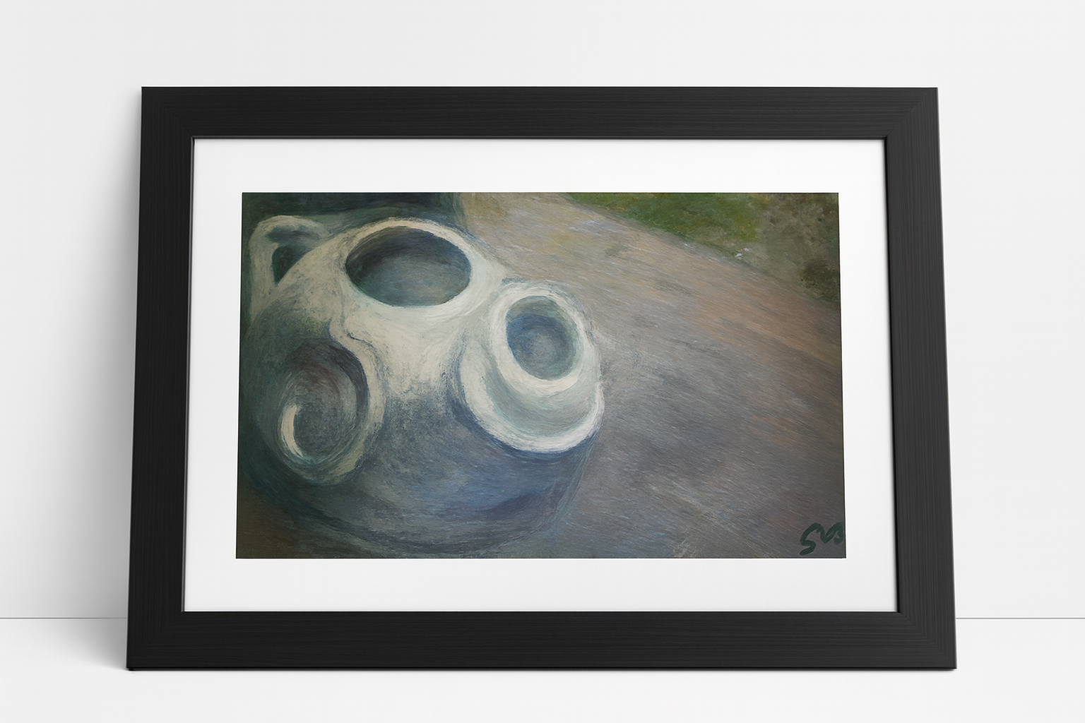 Immerse yourself in the surreal beauty of “Organic Echoes”, a framed painting that blends abstract sculpture with dreamlike ambiance. The central object — a smooth, stone-like form with circular openings and rounded extensions — appears both alien and familiar, inviting interpretation and introspection.